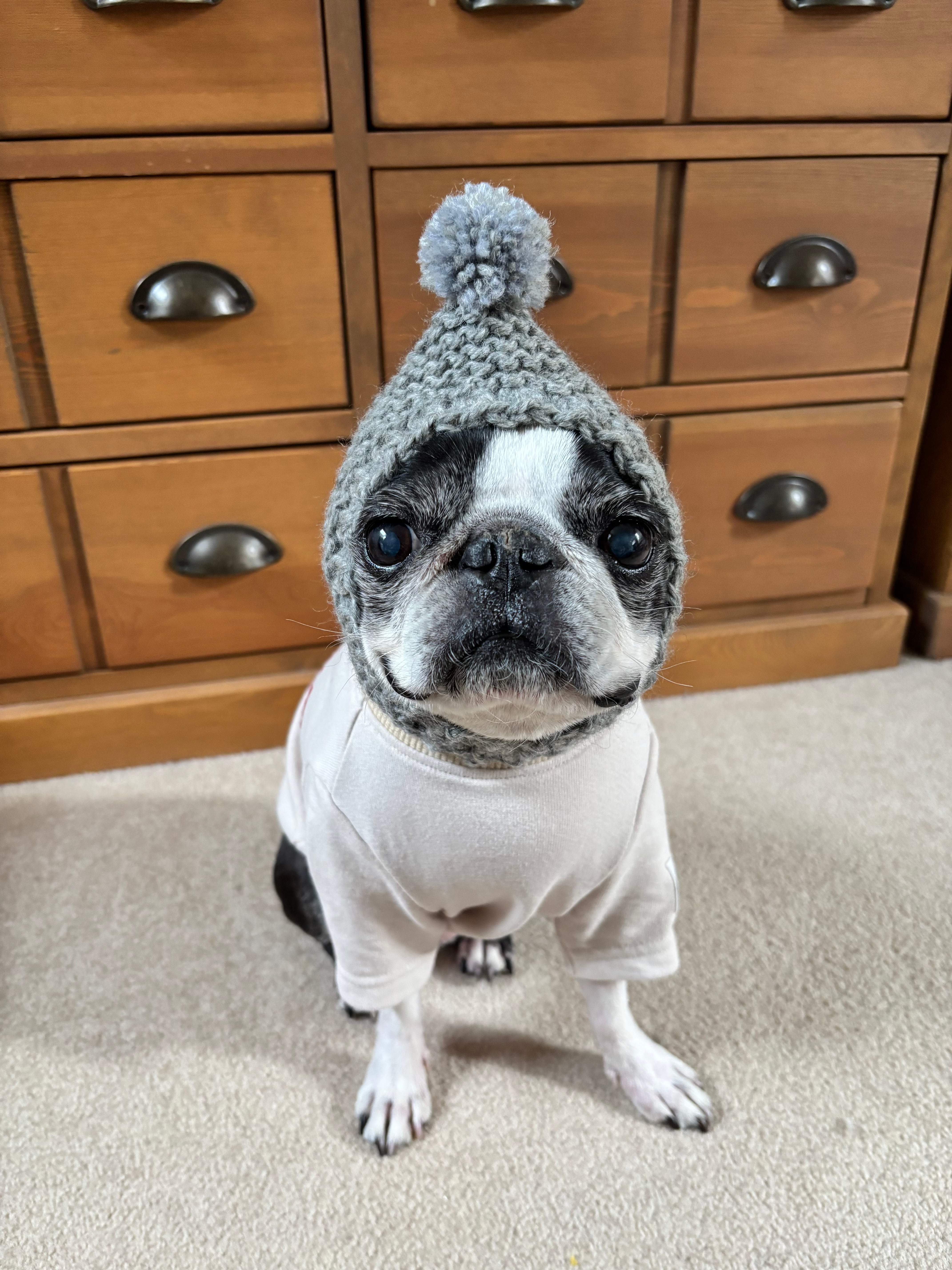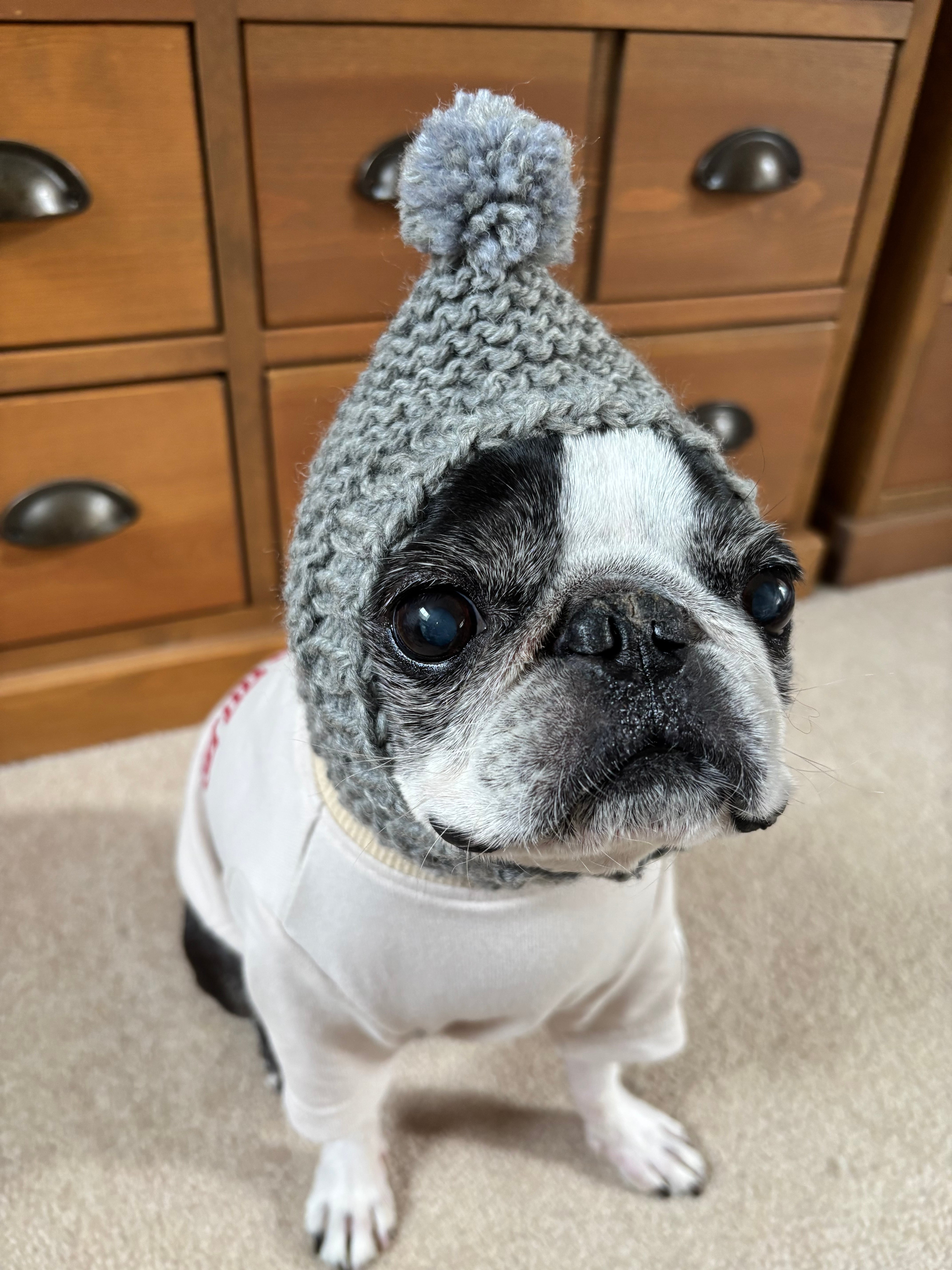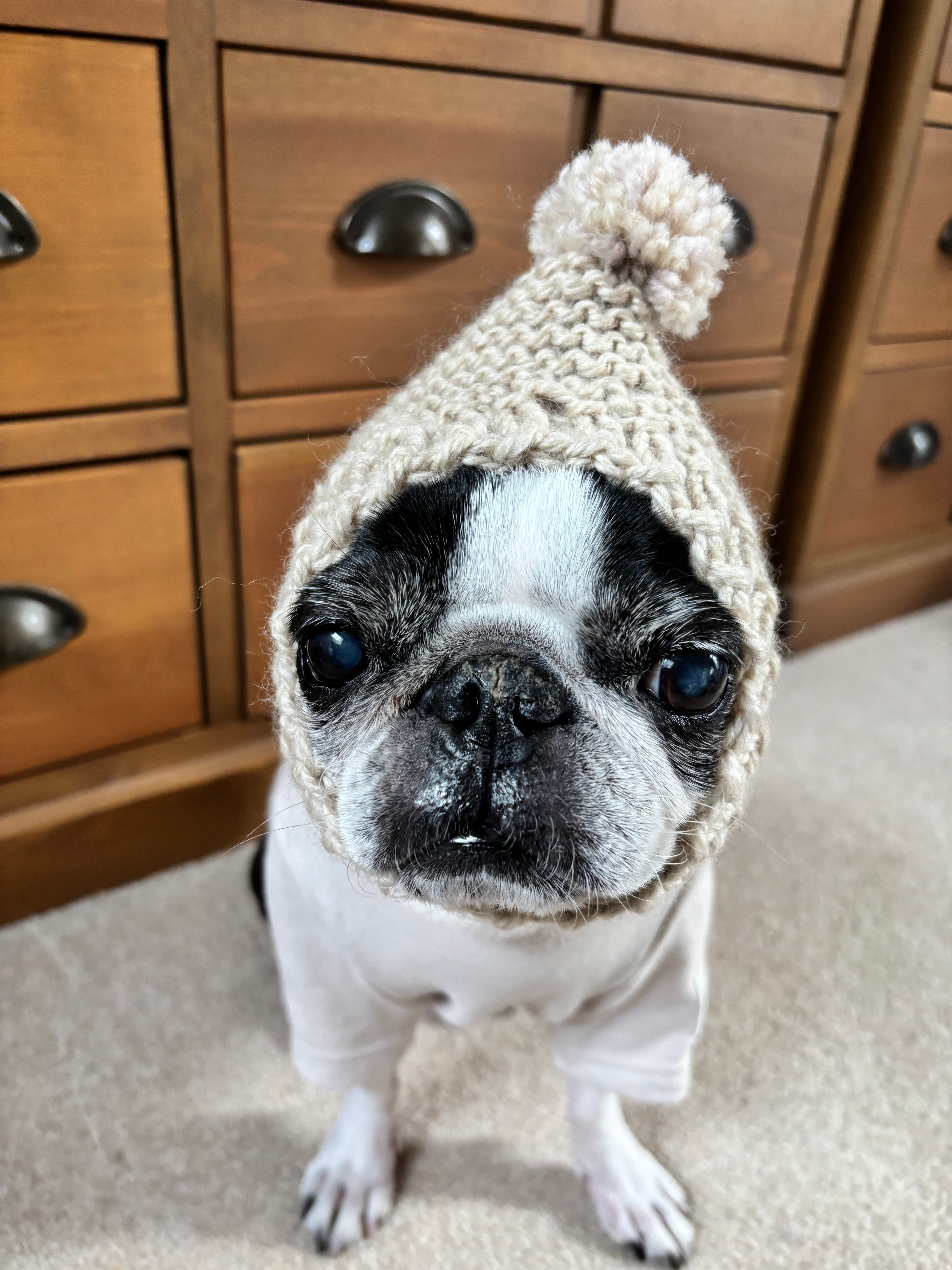 タラ♀:頭周り33cm、着用こびと帽サイズ33、34cm